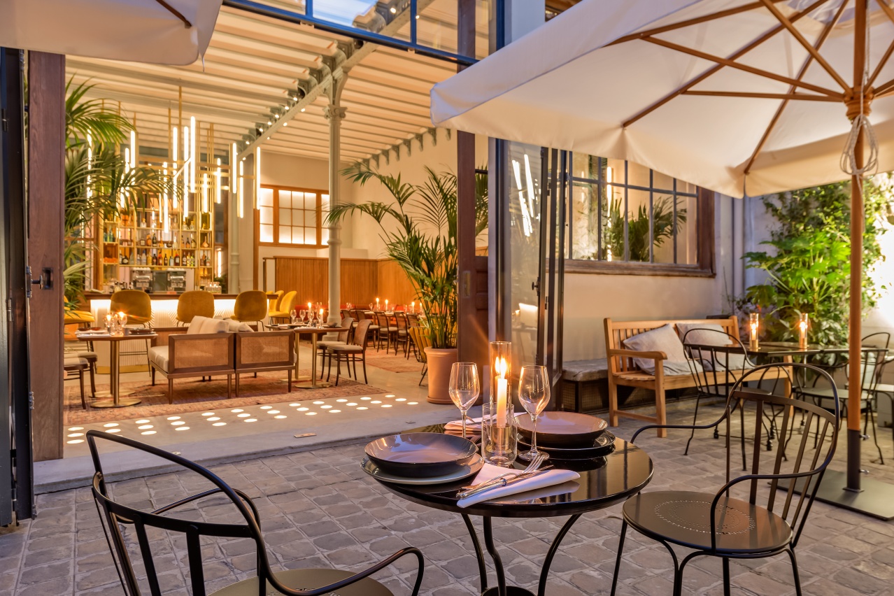 Passée la porte, le large bar, élément central de la vie du lieu, s’impose comme une immense table d’hôtes et invite à des moments de partage. Comme suspendue au temps, cette ancienne remise aux voitures de l’hôtel particulier a conservé son plafond à caissons et ses colonnes métalliques qui structurent l’espace. Elle s’ouvre sur une cour pavée isolée du bruit, pensée comme un jardin secret, pour des déjeuners et diners au soleil dès les premiers beaux jours. Un lieu chaleureux, une ambiance feutrée, un mélange de style et de matières, l’esprit d’un jardin d’hiver, presque comme une adresse confidentielle.